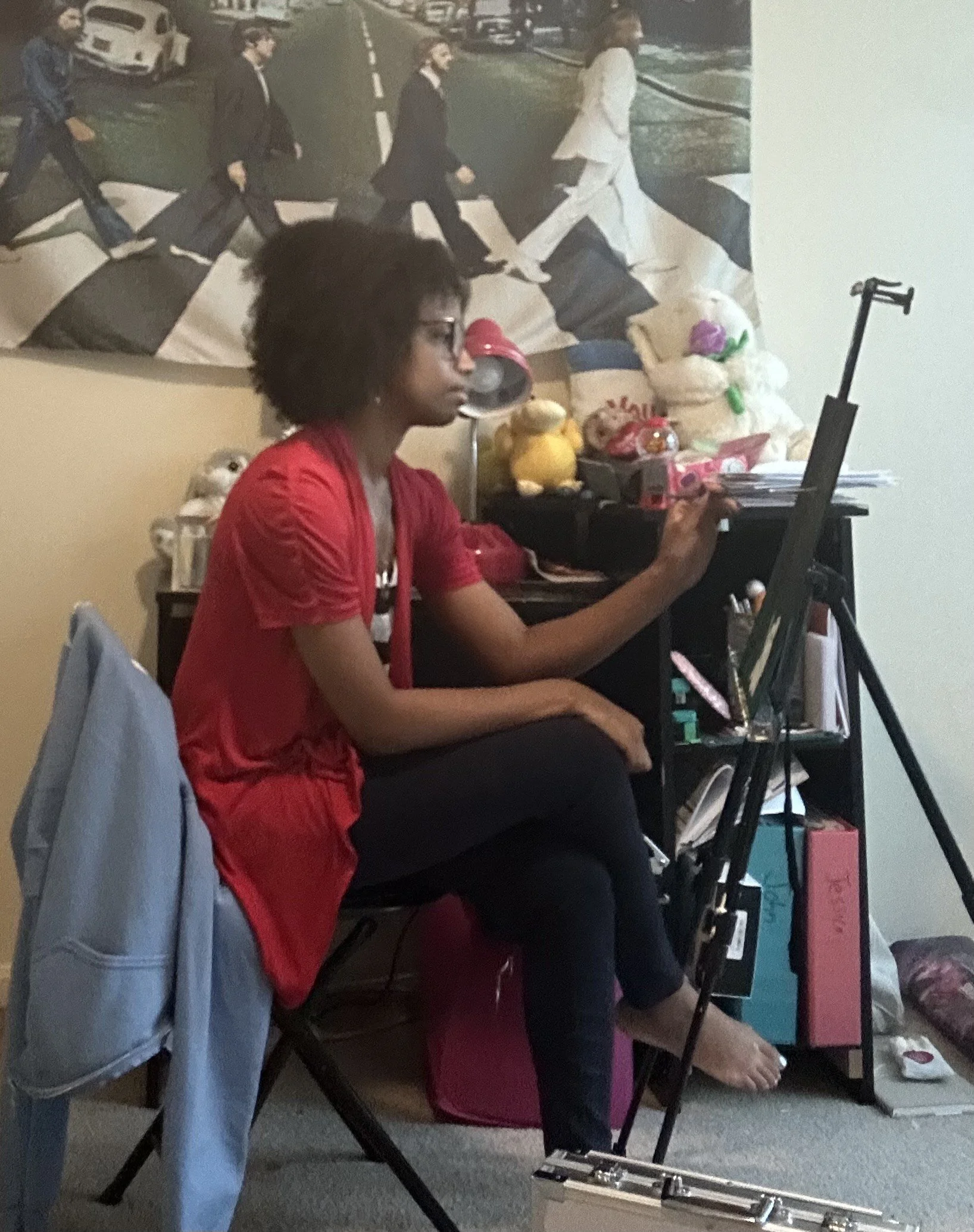 I never had a real dedicated space to create art until recently. Growing up, my setup consisted of storing my materials in a corner or under the bed, and when I wanted to make something, I pulled out what I needed and got comfortable either on my bed or on the floor with some music or a show playing on my laptop until I was done.