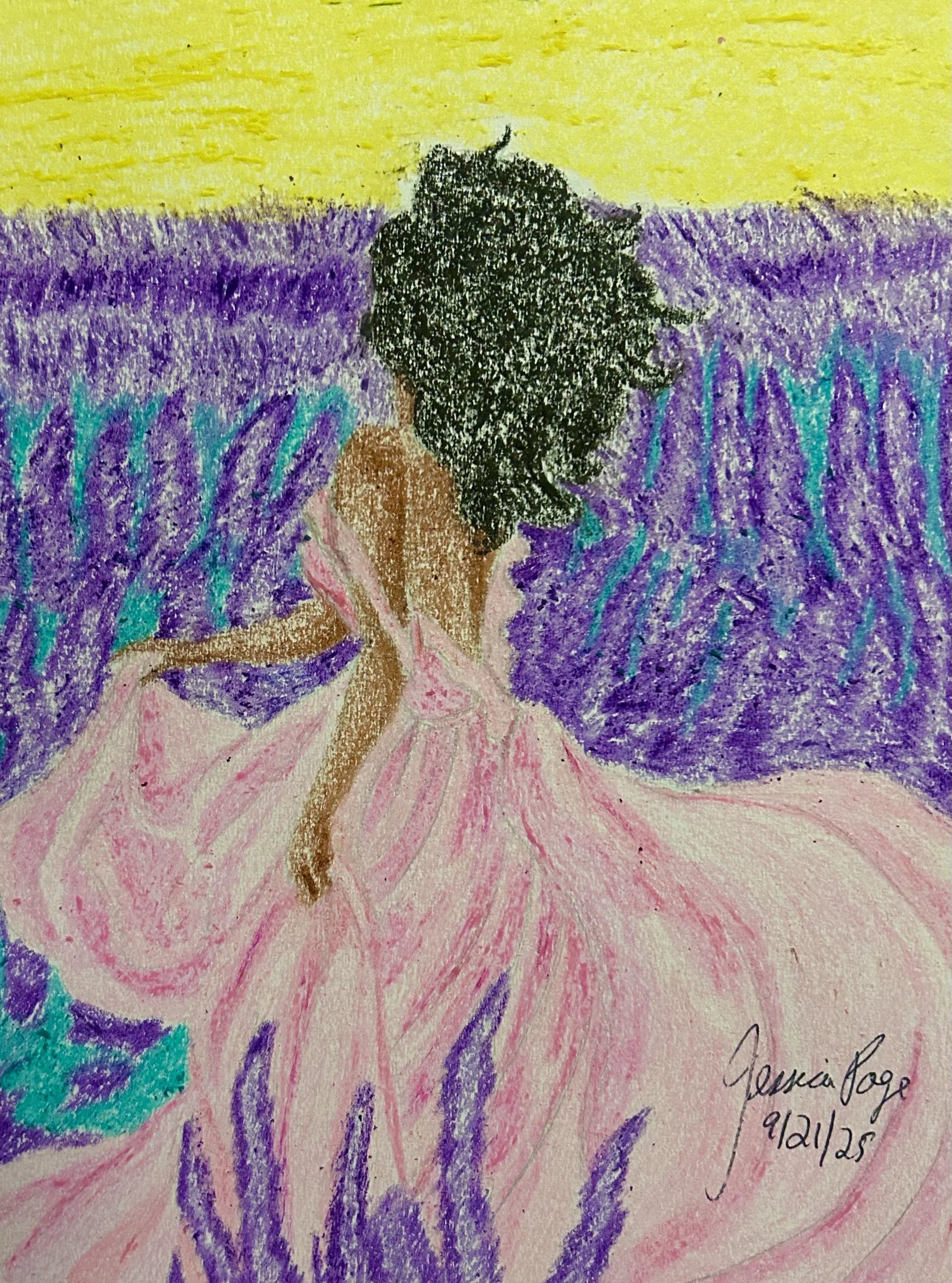 For my next project, I decided to do something less heavily focused on facial features. This was more about the lavender field landscape and the flowing pink dress. I didn’t bother to do much blending in this one. While I did like the colors and the overall atmosphere of the picture, I liked this one less than the first one.