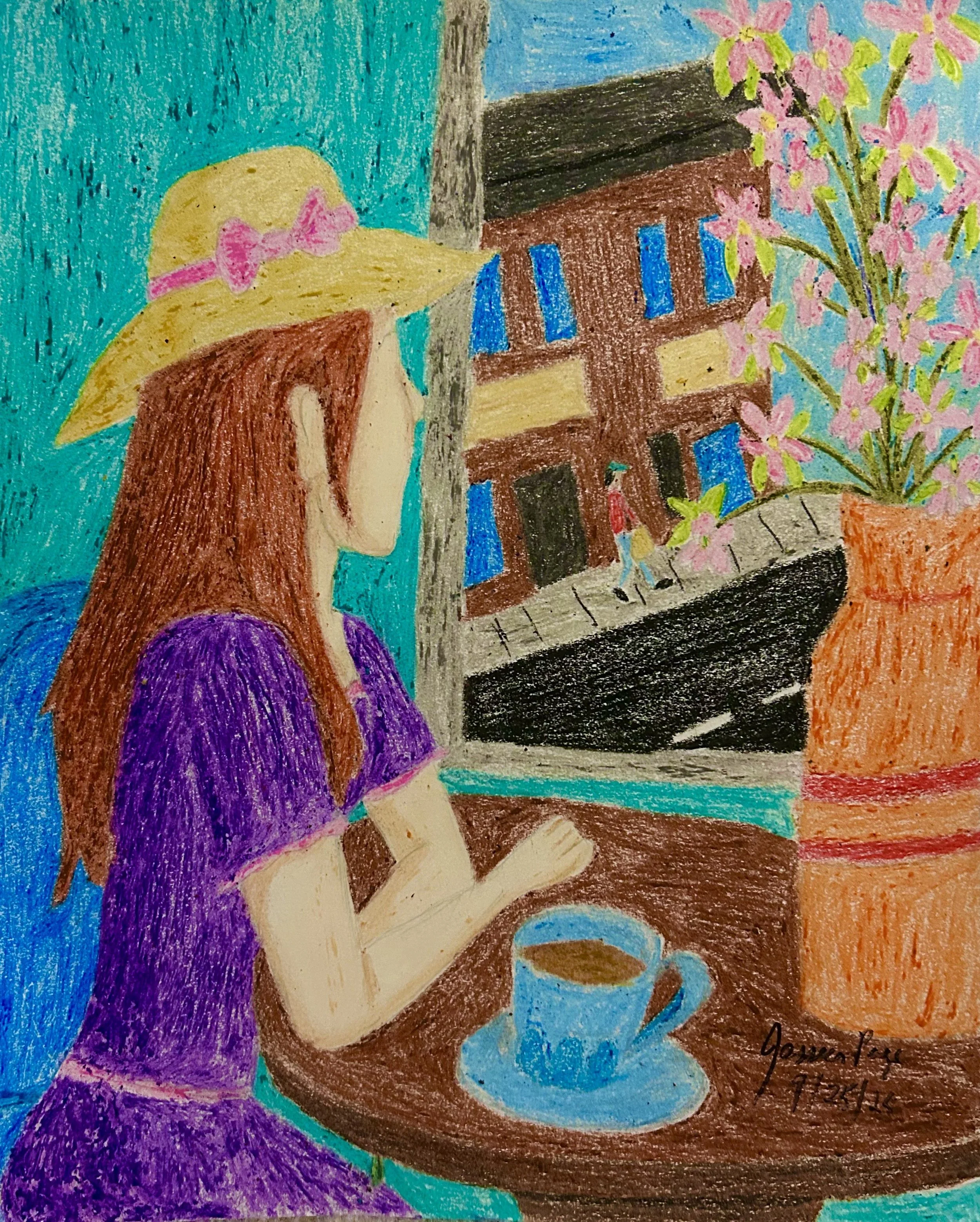 The last one in this series was also less focused on the face and more about the general scene. This one was done on larger paper so I didn’t have to worry about many small details. Although I still wasn’t the biggest fan of the texture of the oil pastels, I was satisfied with how stylized the picture looked and also how I was able to try out layering colors.